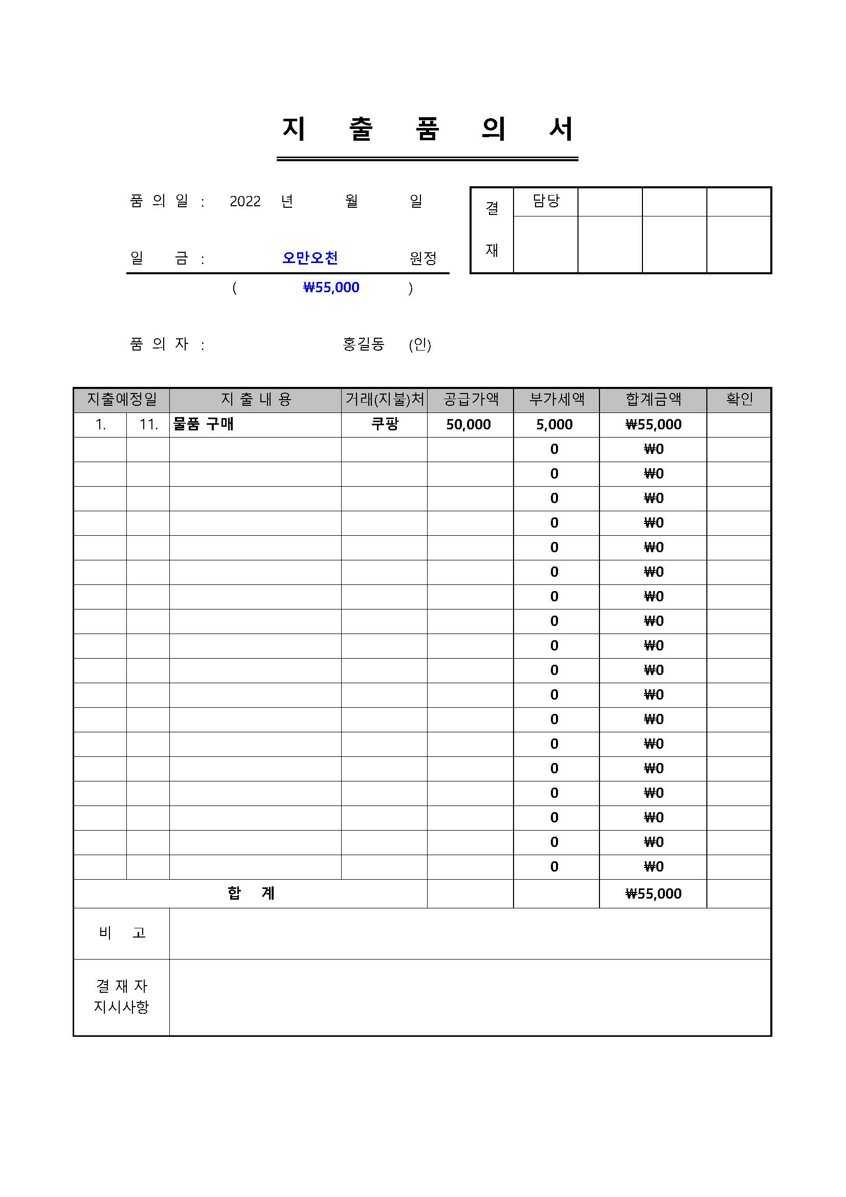 지출품의서 엑셀 서식 양식 무료 다운로드 본문