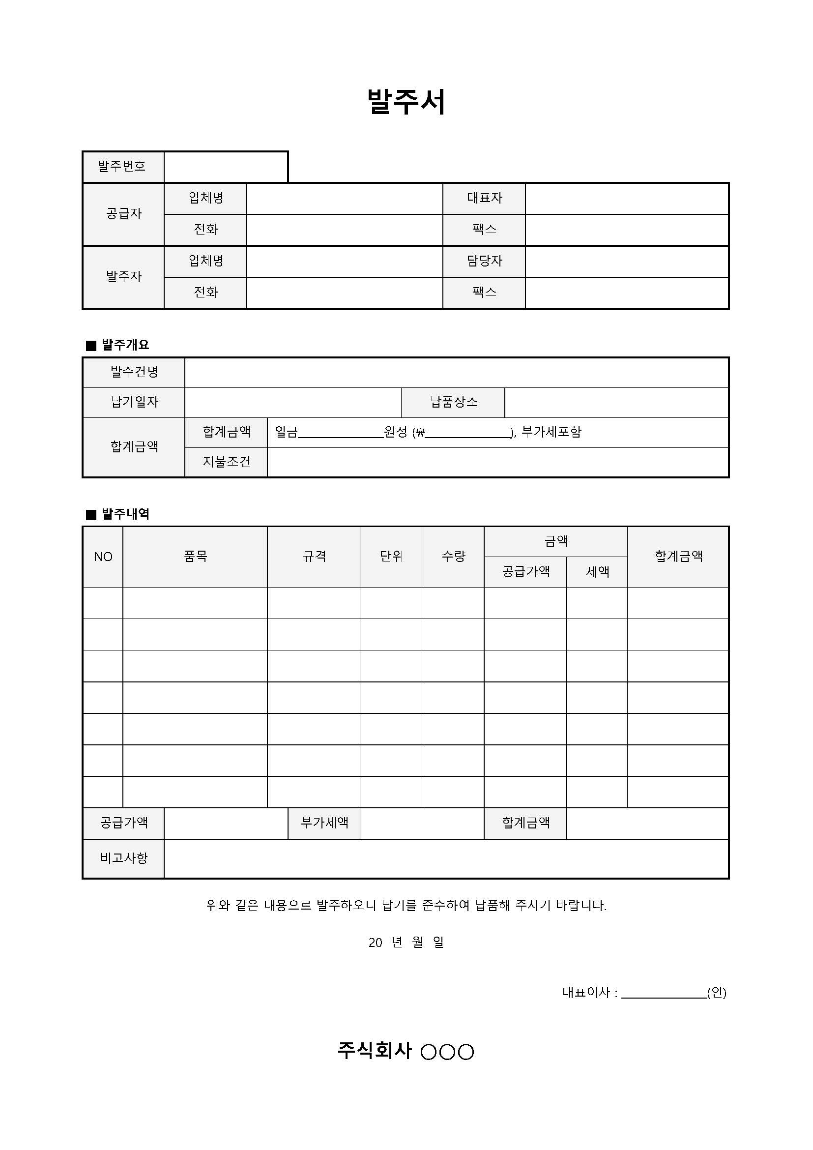 군더더기 없이 딱 필요한 내용만 깔끔하게 넣은 발주서 엑셀 양식이에요.