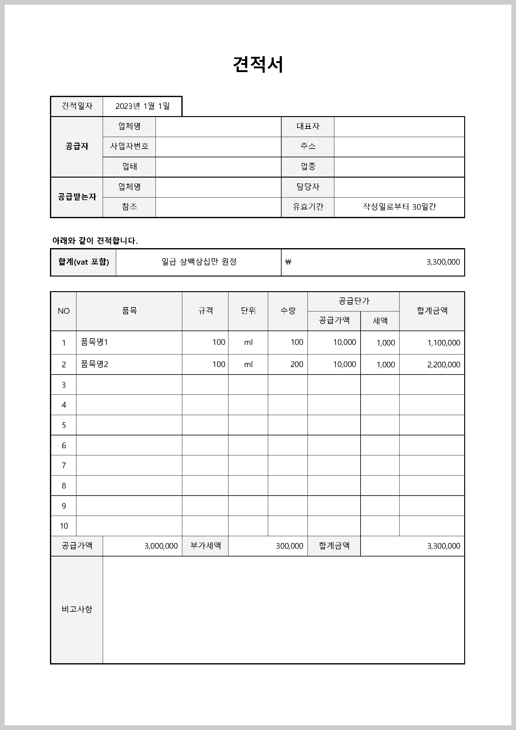 적당한 서식 없으시면 금액 자동 계산도 되는 아래 견적서 양식 사용해 보세요^^