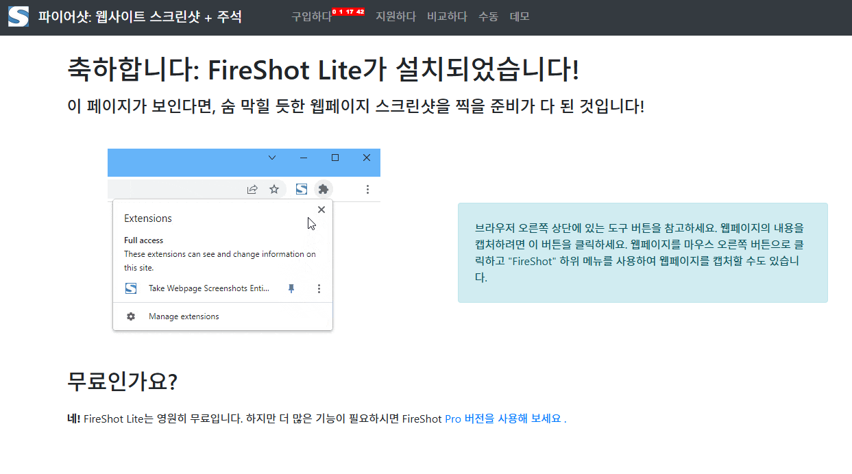 그러면 파일 하나가 다운로드 되면서 설치하라고 해요. 그걸 설치해 주시면 아래와 같은 팝업창이 나오면서 FireShot Pro 버전으로 적용이 됩니다.