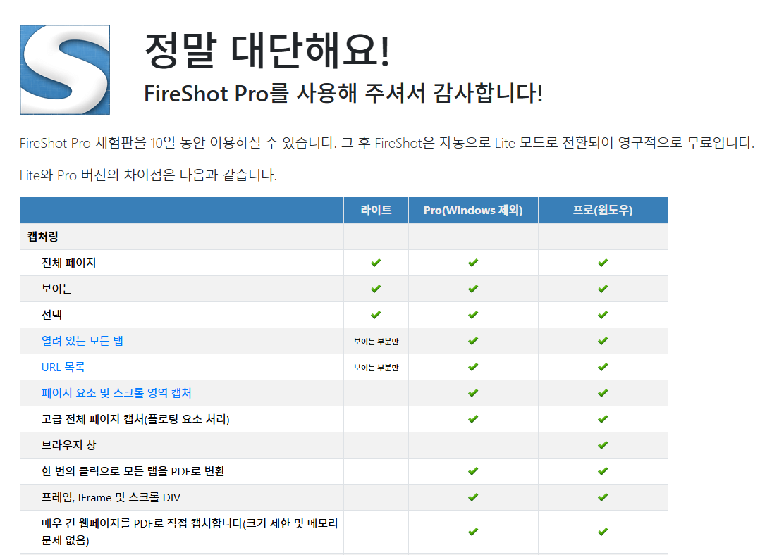 화면캡처 프로그램 FireShot 프로 버전은 10일간 무료로 사용할 수 있어요.