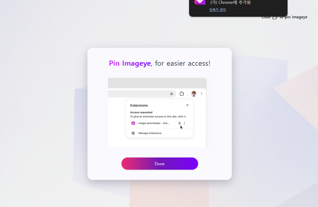크롬 우측 상단에 확장 프로그램에 보면 Image downloader - Imageye 아이콘이 보이실 거에요.