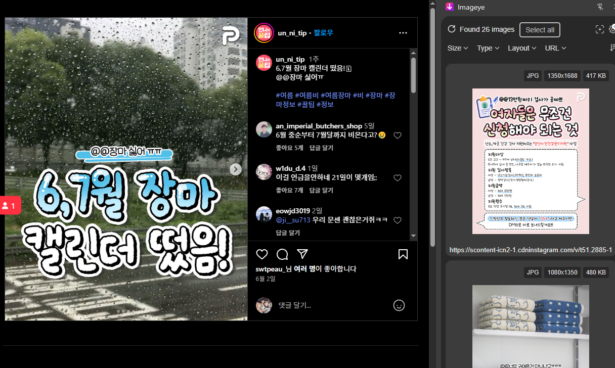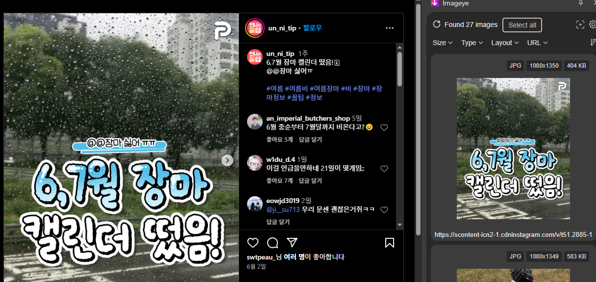 클릭 하시면 우측에 Imageye 창이 나와요. 인스타에 나오는 사진 이미지 들이 모두 나오게 됩니다.